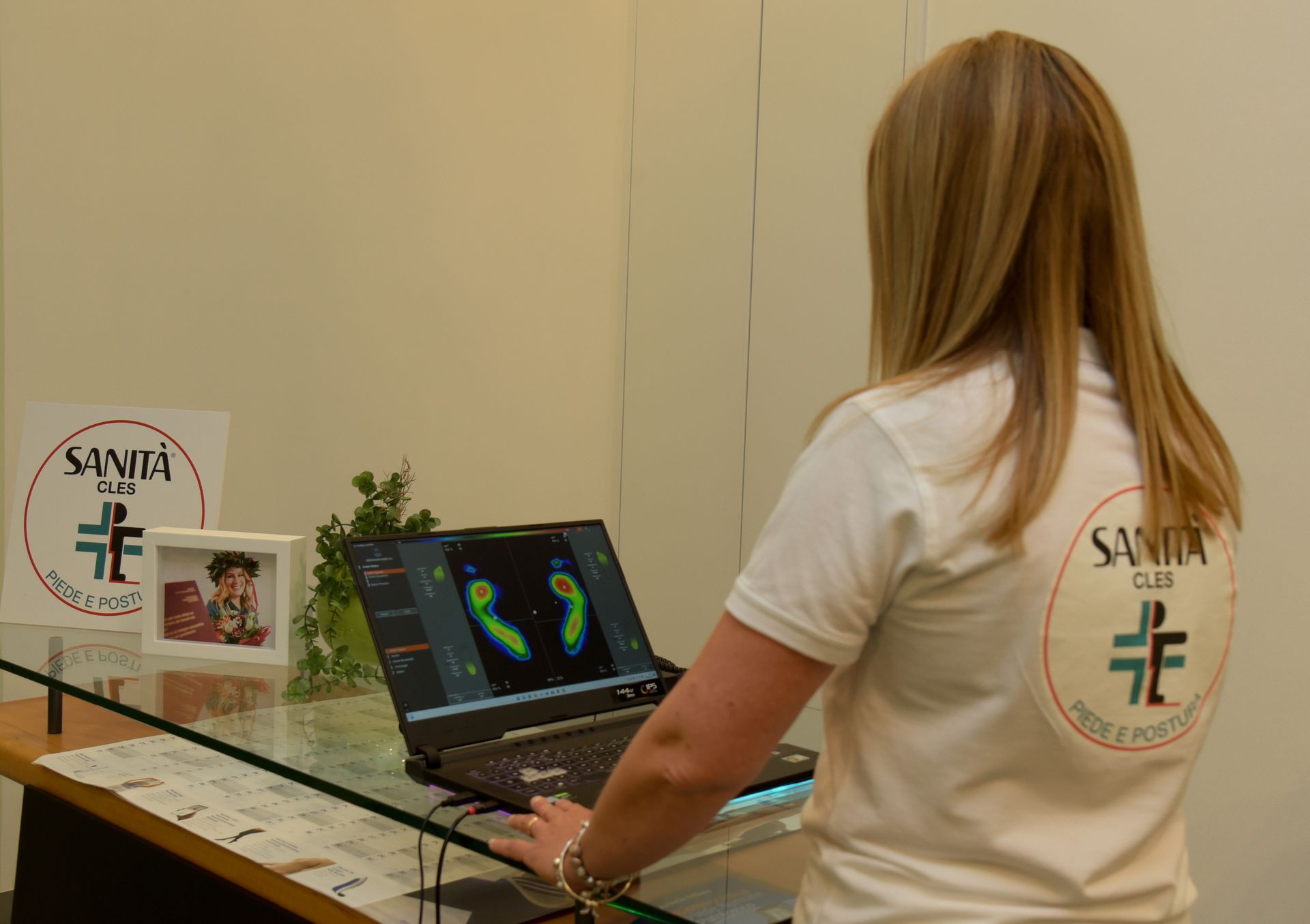 Valuta l’appoggio del piede, identificando le aree di maggiore e minore carico (che sul monitor appaiono come variazione tra il colore rosso ed il blu).